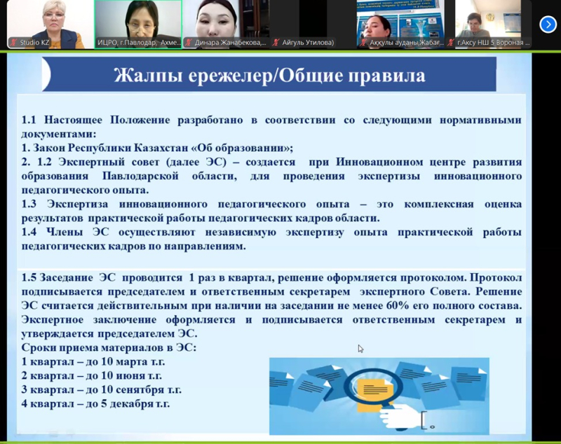 Әдістемелік сағат барысында сараптамалық кеңес жұмысының негізгі бағыттары ұсынылды, мынадай мәселелерге ерекше назар аударылды: инновациялық педагогикалық тәжірибені сараптаудың негізгі бағыттары, онда спикерлер педагогикалық жобалар бағаланатын критерийлер туралы, сондай-ақ сарапшылардан қолдау алу үшін жұмысты тиімді ұсыну жайлы баяндады. Педагогтерді инновацияларды енгізуге дайындау әдістемесі: біліктілікті арттыру және сараптама үшін сапалы материал дайындауда қандай қадамдар жасау қажеттігі қарастырылды.