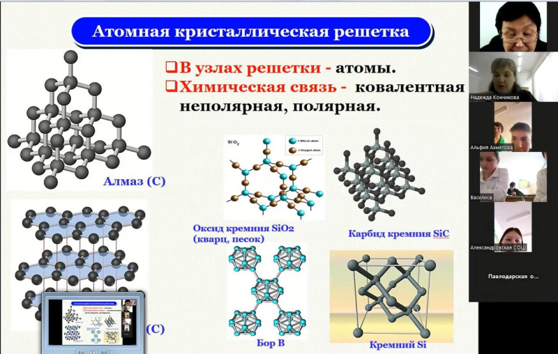 На онлайн- уроках в интерактивном режиме обучающиеся  успешно выполняли лабораторную работу, научились выявлять зависимость свойств веществ от строения их кристаллических решёток: ионных, атомных, молекулярных, металлических, решали  проблемные вопросы.
