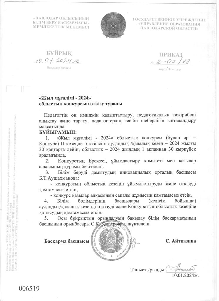 ПРИКАЗ о проведении областного конкурса «Учитель года -2024»